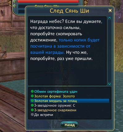И вот мы собрали 8 золотых медалей.... Наконец-то.... Мы подходим к нипу который нас портовал в 79 данж След Сянь Ши и выбираем у него пункт Золотая медаль за плащ: Далее - "Плащ повышающий характеристики" и далее выбираем плащ который нам нужен